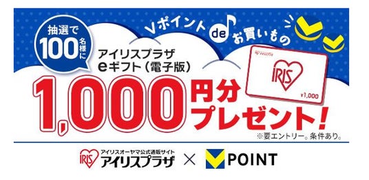 さらに、Vポイントサービスの開始を記念し、「アイリスプラザ×Vポイント 初回限定購入キャンペーン」を開催します。2026年1月14日(水)から2026年2月28日(土)までの間、キャンペーンサイトからエントリーのうえ、Vポイント利用手続き後、Vポイントを1ポイント以上利用して5,000円(税込)以上のお買い物をすると、抽選で100名さまに、アイリスプラザでご利用いただける電子版のギフトカード「アイリスプラザeギフト1,000円分」をプレゼントします。ぜひこのお得な機会に「アイリスプラザ」をご利用ください。