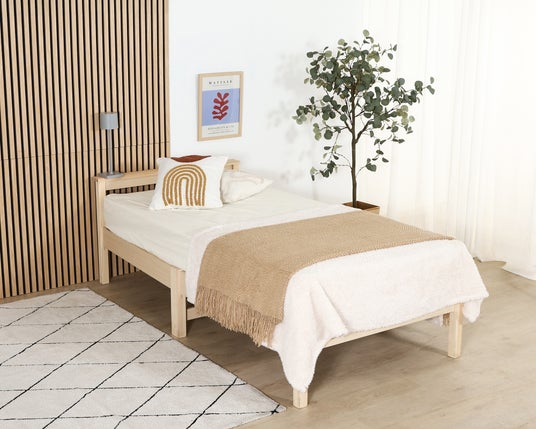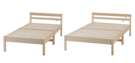 天然木パイン材のやさしい雰囲気で、シングル・セミダブルともに一人暮らしに使いやすいサイズ感。すのこ仕様で通気性がよく、ラッカー塗装でお手入れも簡単。枕元には2口コンセントを備え、充電やライトが便利に使えます。ベッド下は高さ24cmで収納力も十分。日常づかいをスマートに整える一台です。