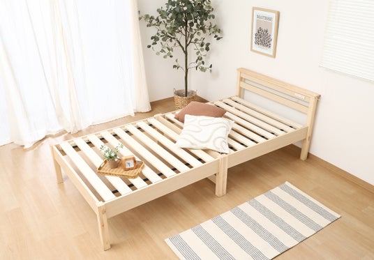 シングル・セミダブルともに、通気性の良いすのこが快適な寝環境をキープします。マットレス横にはスマホや眼鏡を置けるサイドスペース付き。2口コンセントで枕元もすっきり保てます。お掃除ロボット対応&角の丸み加工で使い勝手と安全性にも配慮した、新生活を支えてくれるベッドです。