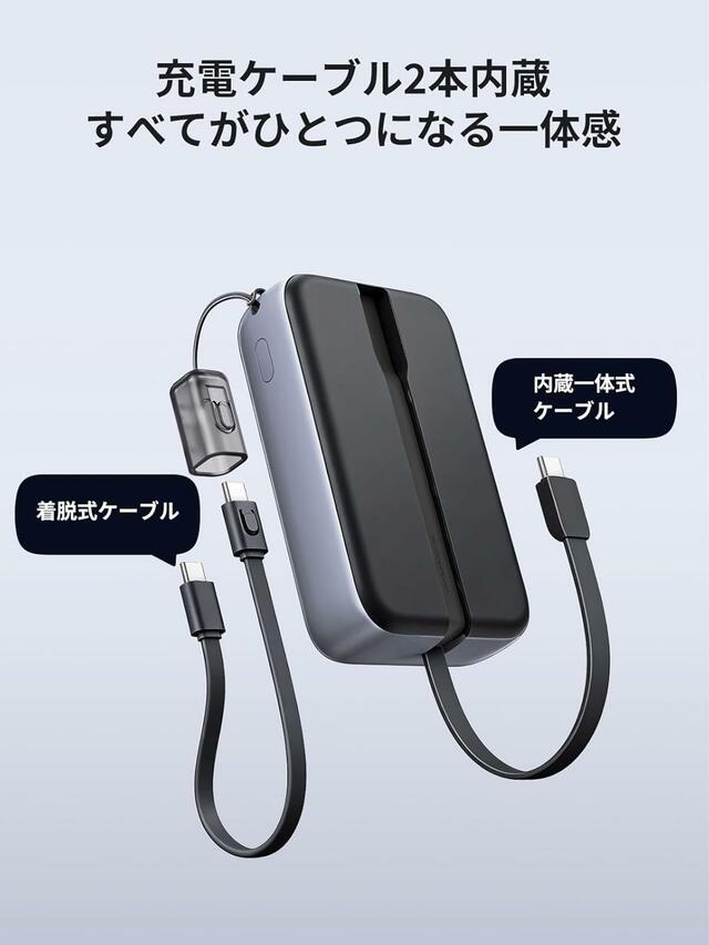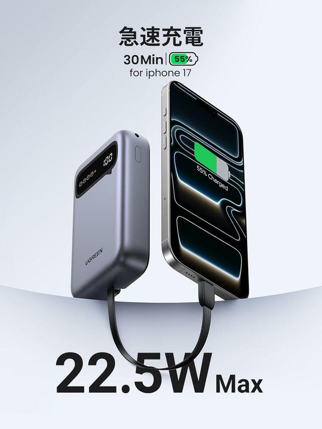 外出時の充電トラブルを減らしたいなら、UGREEN(ユーグリーン)の新作モバイルバッテリー「22.5W 内蔵ケーブル モバイルバッテリー 20000mAh」が頼りになります。