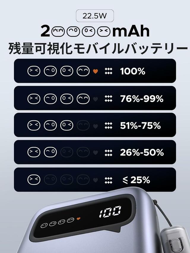 容量は20000mAhと十分で、スマートフォンなら複数回の充電が可能。また、表情やアイコンでバッテリー残量・充電状況を視覚で確認できるディスプレイを搭載しているのも嬉しいポイントです。