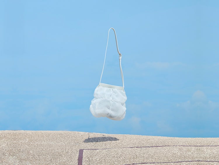 工業用のポリエステルメッシュ素材にギャザーを施し、牛革を組み合わせました。