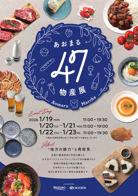 東京建物株式会社(本社:東京都中央区、代表取締役 社長執行役員 小澤 克人、以下「東京建物」)と株式会社みずほフィナンシャルグループ(本社:東京都千代田区、執行役社長 木原 正裕、以下「みずほFG」)は、地域創生に向けた取り組みの一環として、日本全国の名産品を集めた「あおまる47物産展」(以下「本物産展」)を大手町タワー(東京都千代田区)内の「森のプラザ」で、2025年1月より定期開催しています。