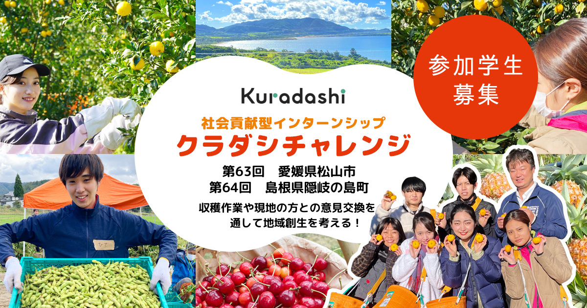 ソーシャルグッドマーケット「Kuradashi」を運営する株式会社クラダシ(本社:東京都品川区、代表取締役社長CEO:河村晃平、以下「クラダシ」)は、2026年3月に愛媛県松山市・島根県隠岐の島町で開催する社会貢献型インターンシップ「クラダシチャレンジ」の参加学生の募集を開始いたします。現地では、せとかや岩ガキの収穫をはじめ、事業者・自治体との意見交換や現地観光などを実施する予定です。