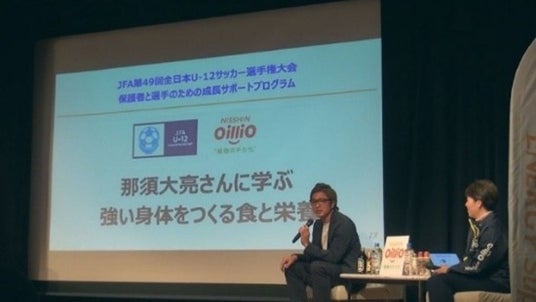 開会式当日、元プロサッカー選手の那須大亮さんをお招きし、“JFA×日清オイリオ「那須大亮さんに学ぶ 強い身体をつくる食と栄養」”と題したセミナーを開催。「日清オイリオENERGY Supporterプロジェクト 公認スポーツ栄養士」の橋本玲子先生にも登壇いただき、選手の保護者・指導者向けに、成長期の子どもだからこそ知っておきたい食と栄養の情報や、試合に向けた食事・栄養補給の方法についてお伝えしました。本内容は1月下旬に特設サイト*1にて公開予定です。