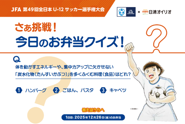 日清オイリオグループ株式会社(社長:久野 貴久)は、日本サッカー協会(以下「JFA」)が主催する「JFA 第49回 全日本U-12サッカー選手権大会」に協賛し、スポーツを愛するすべての人を応援する“ENERGY Supporter”として、“スポーツ×食の大切さ”を発信しました。
