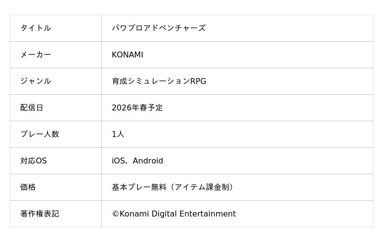 株式会社コナミデジタルエンタテインメントは、新作モバイルゲーム『パワプロアドベンチャーズ』(以下『パワアド』)を2026年春から配信することをお知らせします。また本日より事前登録を開始しました。
