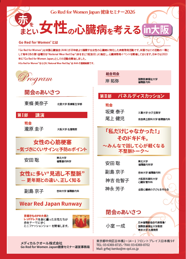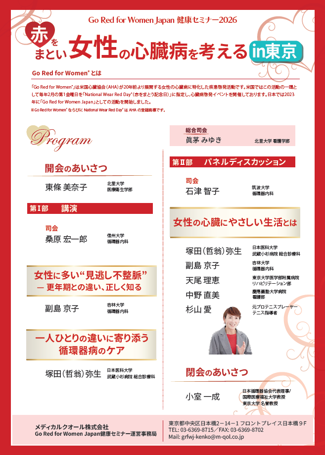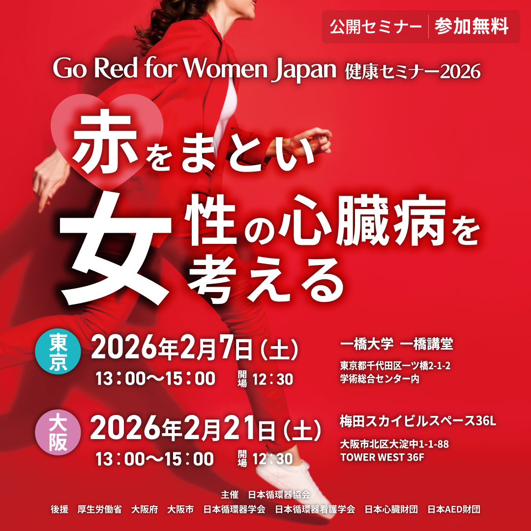 一般社団法人日本循環器協会(以下、日本循環器協会)は、女性の心臓病啓発活動「Go Red for Women Japan健康セミナー2026:赤をまとい女性の心臓病を考える」を開催いたします。