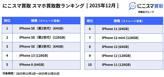 2025年12月の販売数ランキングでは、「にこスマ」で開催したセールやキャンペーンの影響もあり全体的に取引数が大幅に増加する中、iPhone SE(第3世代)(64GB)が7か月連続で1位にランクインしました。