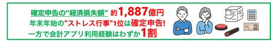 調査の結果、確定申告経験者の約8割(82.3%)が「確定申告はストレス」と回答し、「年末の大掃除」「年賀状の手配」など、年末年始におけるストレス行事の中でも確定申告が1位となりました。また、確定申告で負担に感じる作業として最も多かったのは「やり方を思い出すこと」。加えて、“確定申告あるある”として「直前期に一気に作業する」「領収書を紛失する」といった声が挙がり、準備や記憶の負担がストレスの大きな要因となっている実態がうかがえる結果となりました。また、作業・書類作成には2人に1人が「Excel・スプレッドシート」や「手書き」といった手作業で対応していることが判明し、このような確定申告にかかる時間的負担から推計される経済損失額を算出したところ、約1,887億円※にのぼる可能性が明らかになりました。