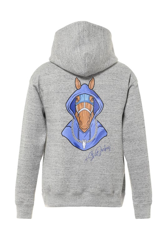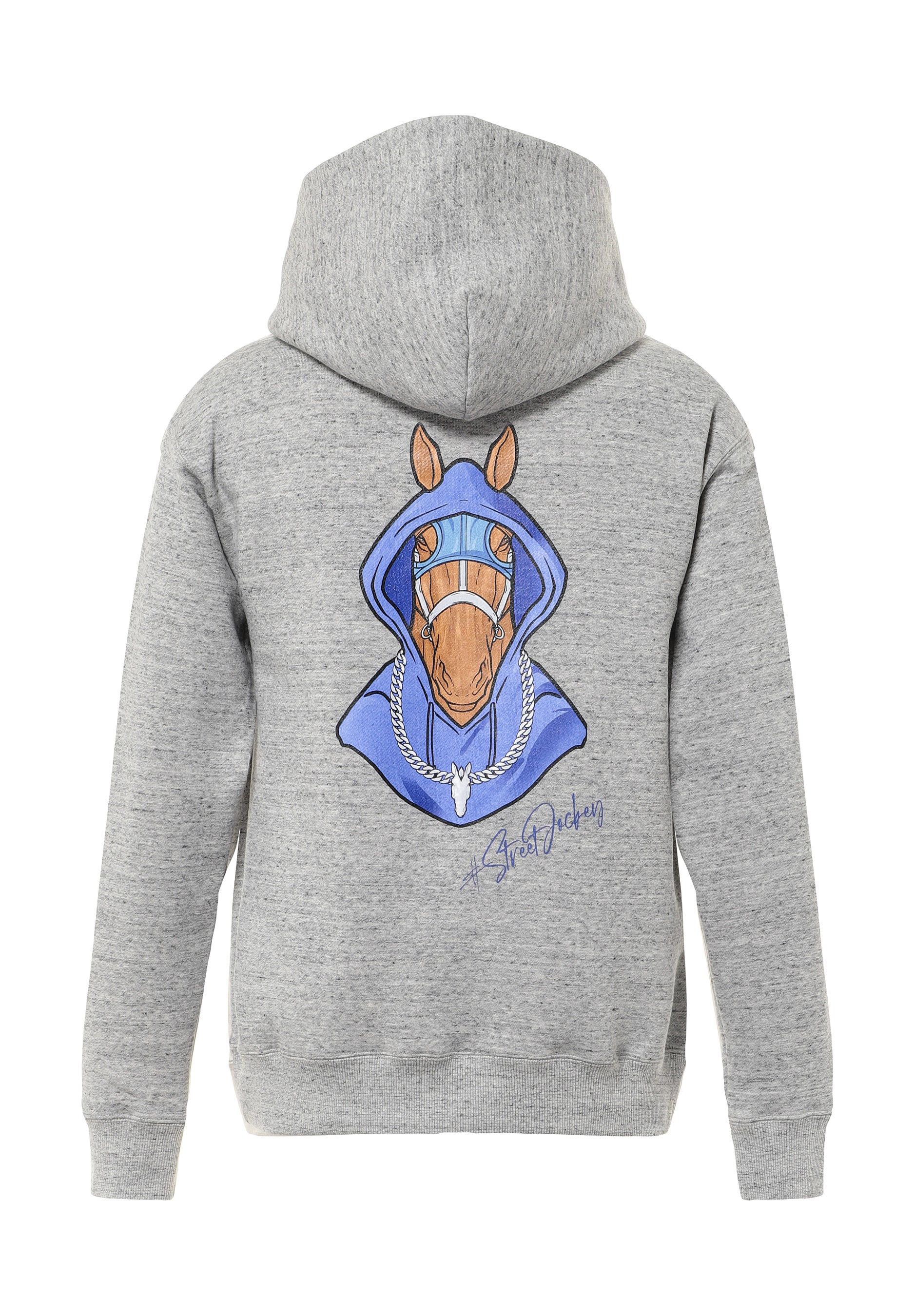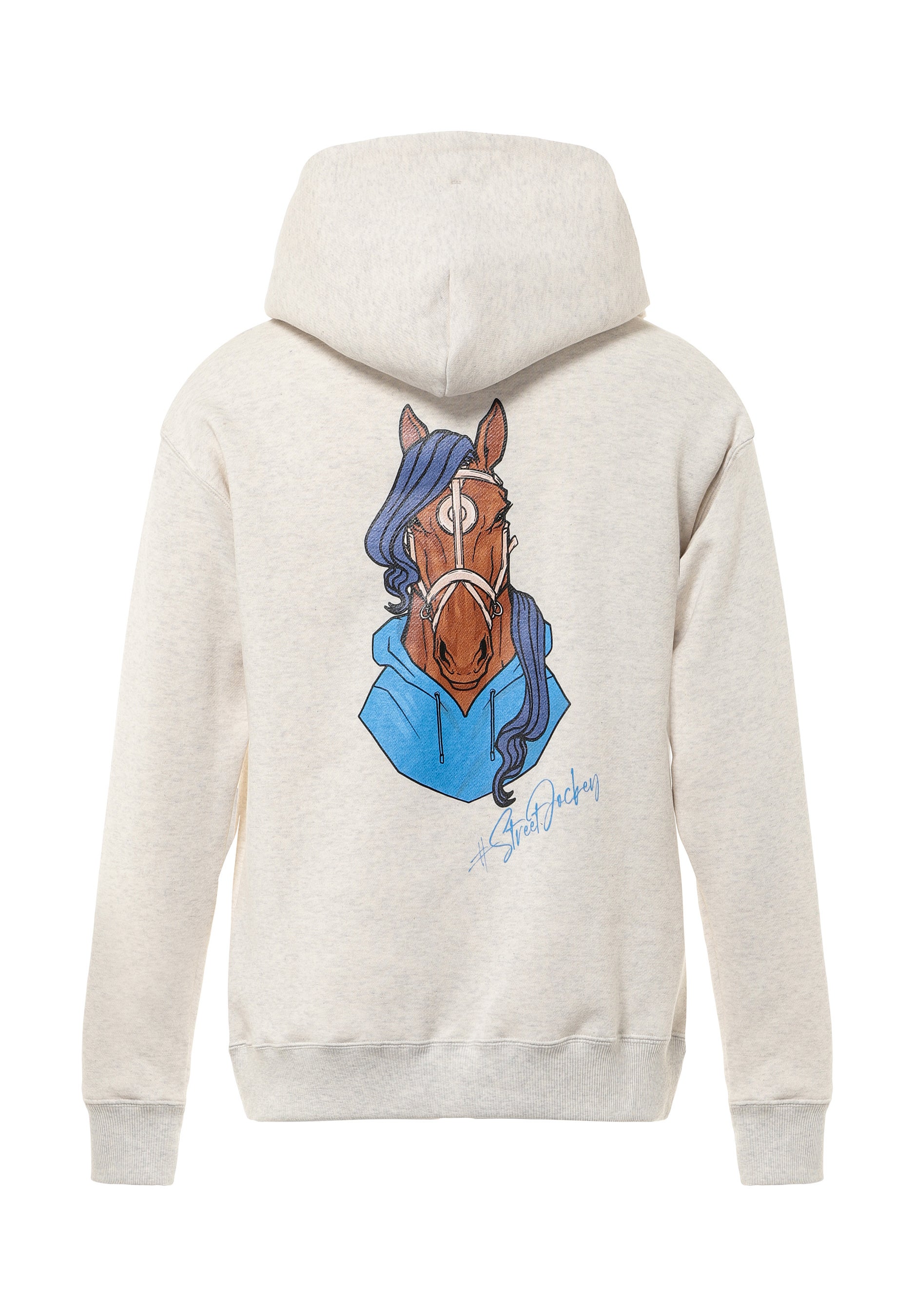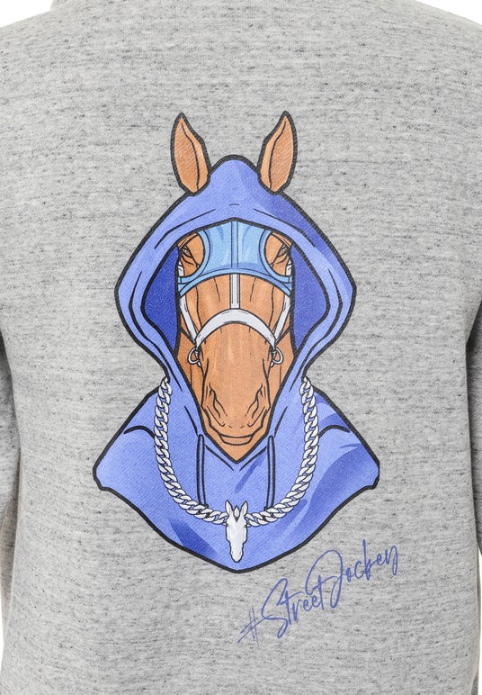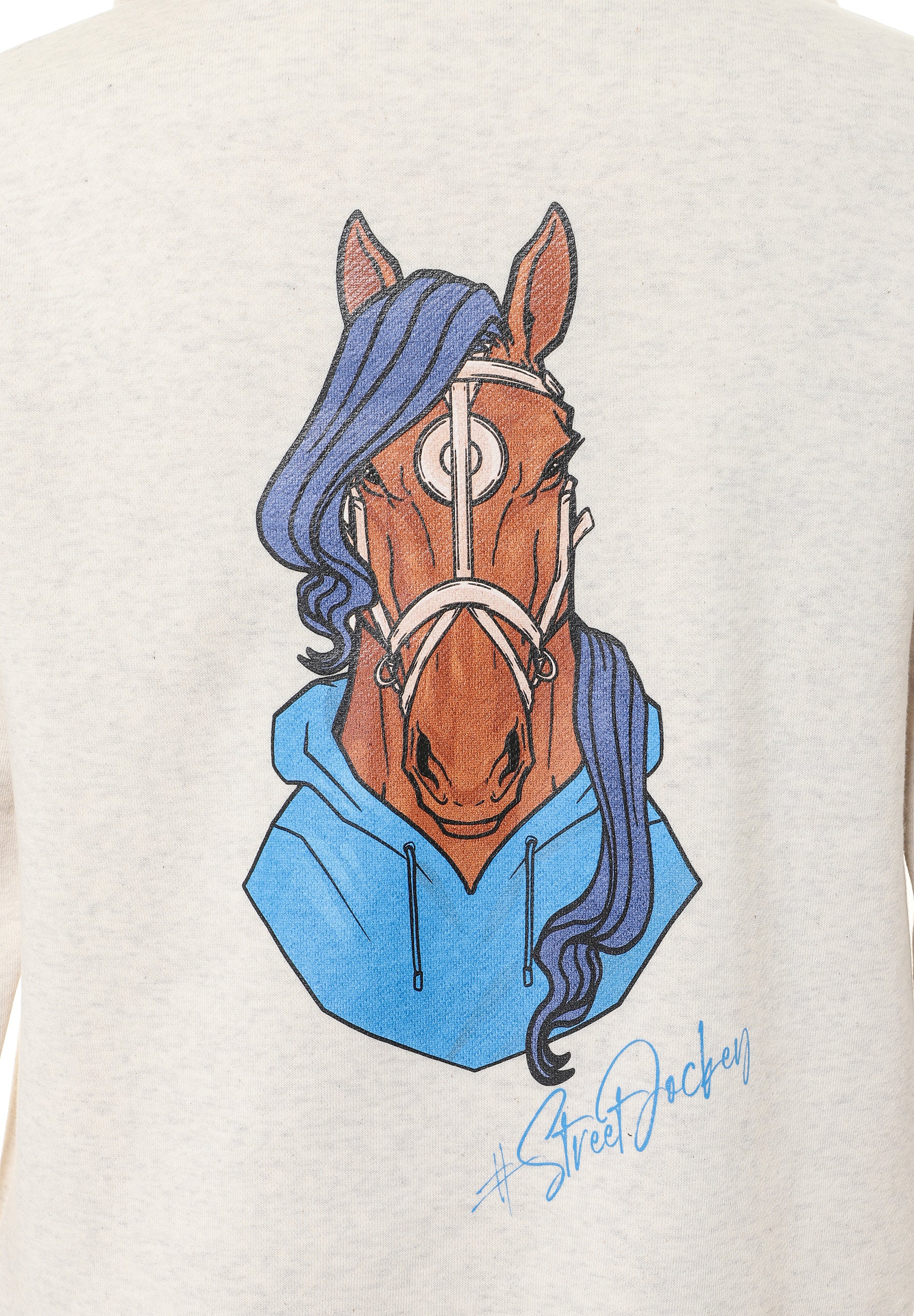 背面には、ストリートウェアを纏った馬を描いたオリジナルグラフィックを配置。シルクスクリーン
