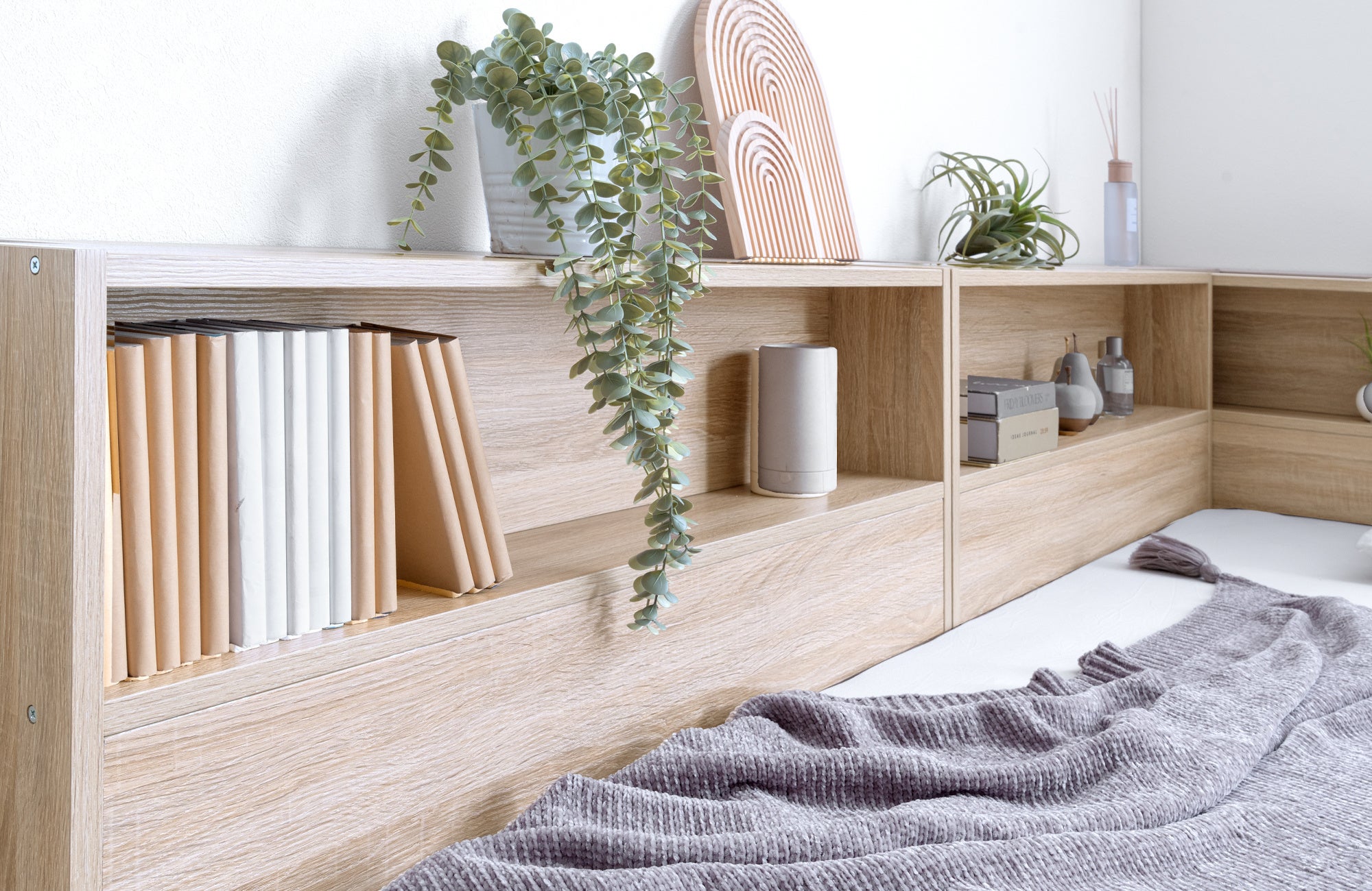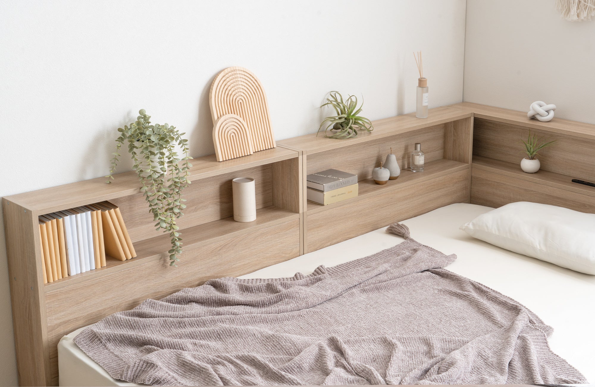 L字型に広がる収納スペースにより、必要な物を手の届く位置にまとめて置くことができます。また、インテリア小物を並べてディスプレイすることで、機能性だけでなくインテリア性も兼ね備えたベッド周りを演出します。