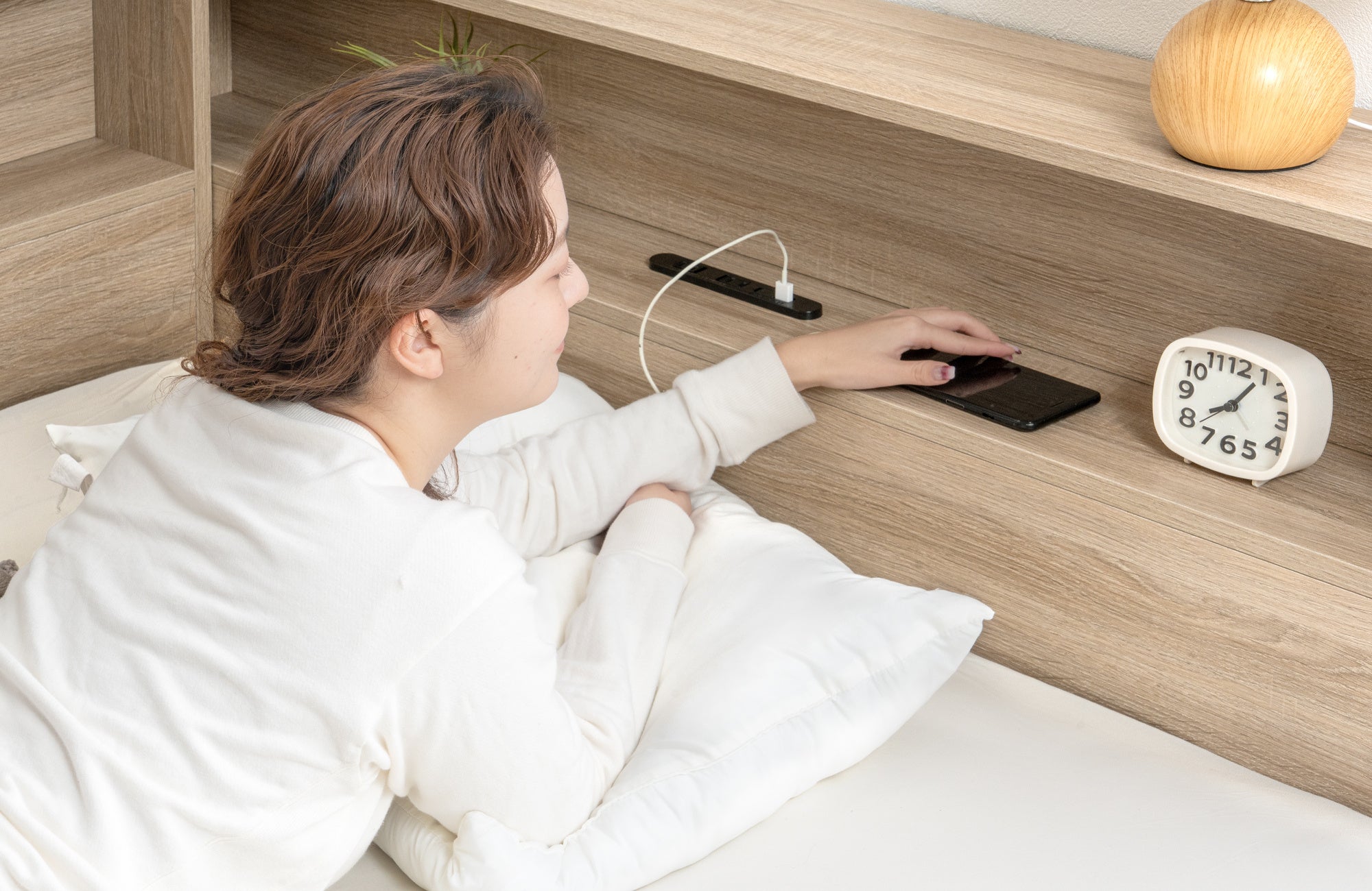 日常的にベッド周りで使用することの多いスマートフォンや目覚まし時計、間接照明、眼鏡などを、手に届く位置にまとめて配置することが可能です。