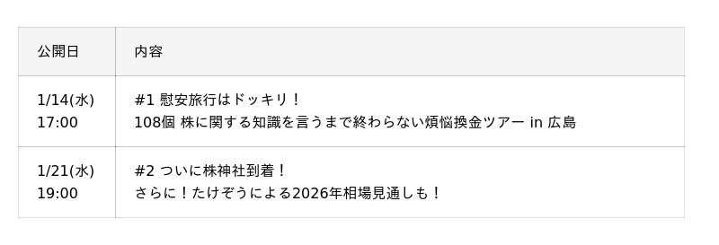 #1では、「慰安旅行」と聞かされて広島に集まった3人が、旅の費用はすべて自らの知識で賄わなければならないという過酷なルールを告げられるところからスタートします。早速、広島名物のお好み焼きをかけて、2026年に注目のセクターや個別銘柄といった実践的な知識を披露します。さらに、日本一痛いと評判の足つぼマッサージに挑戦するなど、バラエティ要素も満載でお届けします。