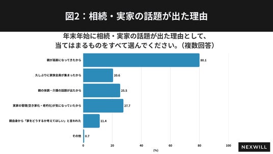 また、年末年始に”実家じまい”の話題が出た理由として「親が高齢になってきたから」(80.1%)が最も多い結果になりました。加えて、「実家の管理や空き家化、老朽化が気になっていた」(27.6%)「久しぶりに家族全員が集まった」(20.5%)など、親の将来と実家の維持管理を現実的に考えざるを得ない状況が、実家じまいに関する課題を顕在化していることがわかりました(図2)。