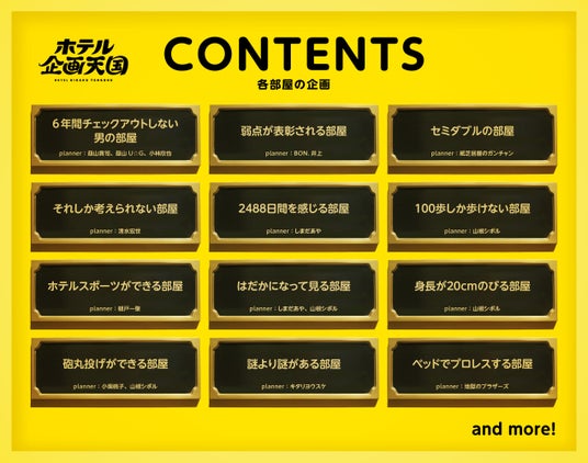 紙芝居屋、エッセイスト、ゲームデザイナー、劇作家、ダンサー、謎解きクリエイターなど、ジャンルを問わず関西中のクリエイターたちが一斉にチェックインし、プランナーとして自由に考えた企画が、全客室・全館にわたって展開されます。