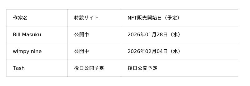 2026年1月28日(水)より、3名の作家によるNFT販売を順次開始いたします。