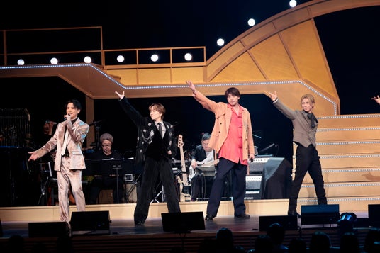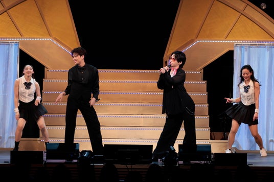 まずは、「What You Own」(『RENT』平間・甲斐)、「行こうよ どこまでも」(『アラジン』小林・木下)、「you are the one that I want」(『グリース』三浦・屋比久)と、デュエットが続く。いずれも出演作品からの曲。平間にとって『RENT』は自身をミュージカルの世界に入れてくれた作品とあって思い入れは強い。また、『グリース』は三浦のリクエストで、約4年ぶりとなる屋比久との共演が実現した。続いては、「彼らの心は天国に」(『ジーザス・クライスト=スーパースター』森崎)、「So Close~そばにいて~」(『魔法にかけられて』岡宮)、「エニシング・ゴーズ」(『エニシング・ゴーズ』sara)。さらに、『キンキーブーツ』から「Soul of a Man」を東が、「Hold Me in Your Heart」を甲斐が歌い、東のチャーリー、甲斐のローラが再び舞台に浮かび上がった。屋比久がコアな部分で繋がれる曲という「私が生きてこなかった人生」(『天使にラブ・ソングを~シスター・アクト~』)に続いては、平間の「Willkommen」(『キャバレー』)。ここで平間が、それまでもキレと芝居心のあるダンスを見せていたアンサンブル8名(北村毅、菅井理久、中島康宏、原田千弘、廣瀬喜一、柳田真悠子、山口遥菜、山村菜海)を紹介して、「これからも舞台で活躍するのでぜひチェックしてください」と客席に呼びかけ、ミュージカル愛が広がっていく。