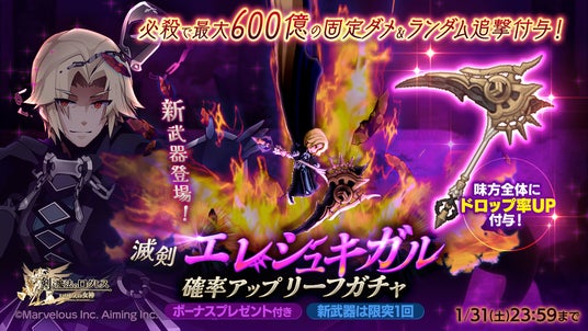 株式会社マーベラス(代表取締役社長:照井 慎一/所在地:東京都品川区)は、スマートフォン向け本格オンラインRPG『剣と魔法のログレス いにしえの女神』において、2026/1/14(水)に「ダイスダービーDX」のクエスト追加、および新武器がラインナップした「滅剣エレシュキガル確率アップリーフガチャ」の販売を含むアップデートを行ったことをお知らせいたします。