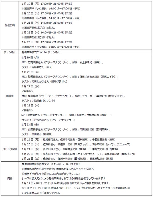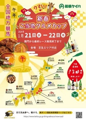 また、場内ではハートビートナイト抽選会やビギナーズカウンターなど競馬ビギナーも楽しめるイベントの他、「全国地方競馬 ウマい! 新春ご当地グルメカップ」を実施いたします。熱戦が続く1月の船橋ケイバを楽しみましょう!