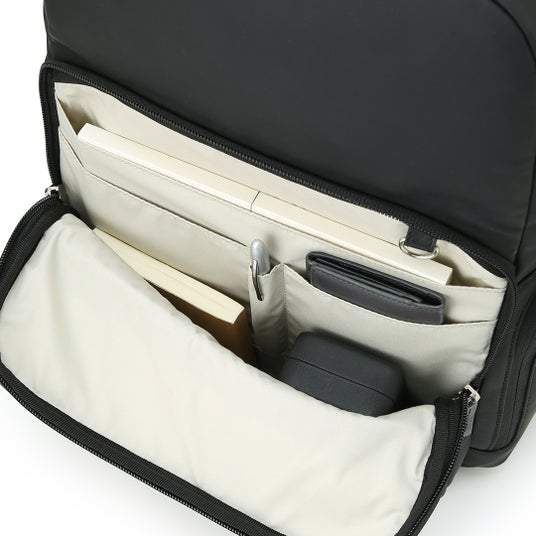 ボディには軽くて水に強い高品質なポリウレタン素材を採用。ショルダーベルトなどの負荷がかかる部分には、体にフィットするしなやかな本革を組み合わせました。国内の一泊出張も想定した大容量サイズながら、軽やかさも実現しました。