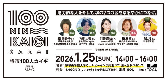 堺市で活動する「人」に焦点を当て、その生き方や思いに触れることで緩やかなコミュニティを作る「堺市100人カイギ」は、第3回となるイベント(Vol.3)を2026年1月25日(日)、泉ヶ丘ひろば専門店街内の「帝塚山学院大学ウェルビーイング共創ハブ 泉ヶ丘駅コモンズ」にて開催いたします。