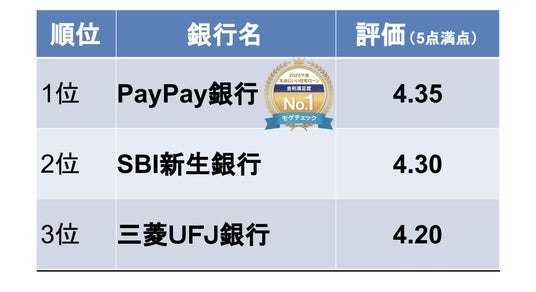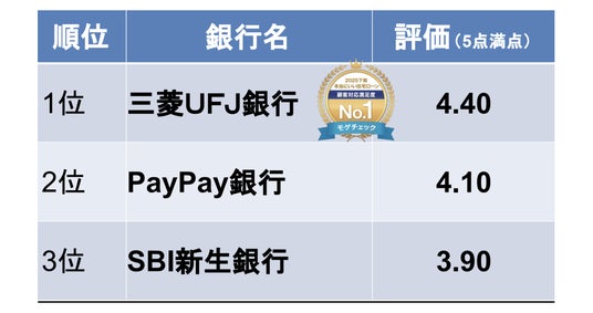 2位はSBI新生銀行です。「スマホ契約などの縛りがない中では最安」「適用要件が緩やか」といった、利用のしやすさと低金利のバランスが評価されました。3位には三菱UFJ銀行がランクイン。「大手としてはかなり低金利」と、メガバンクでありながらネット銀行に匹敵する低金利を実現している点に驚きの声が集まりました。また、昨今の情勢から「金利上昇に強そう」という大手ならではの信頼感も満足度につながっています。