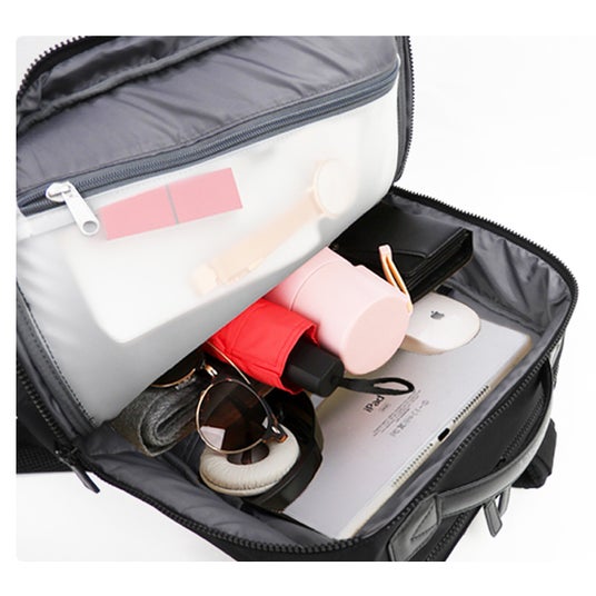 ノートPCや 傘、カードなどを自由に収納できるスペースが配置されており、荷物の整理に便利です。