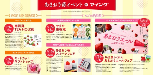 期間中は、JA全農ふくれんタイアップイベント「あまおうエールフェア」をはじめ、様々なイベントを実施します。春の訪れをいち早く告げる“あまおう処マイング”へぜひお越しください。