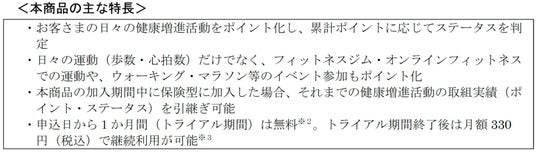 住友生命は、2023 年3月からお客さまの健康増進活動により幅広く貢献するため、保険契約と本プログラムを切り離して利用できる「Vitality スマート」を販売開始し、これまで約11万名のお客さまにご利用いただいています。こうした中、Vitalityスマートをご検討いただいているお客さまからは「申込前に本プログラムを体験したい」といった声を多数いただいており、より幅広いお客さまの健康増進活動に貢献するため、申込日から1か月間無料で本プログラムの一部を体験(トライアル)いただける本商品を開発しました。