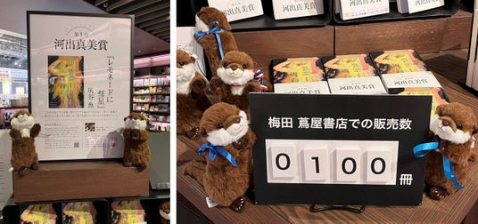 第1回「河出真美賞」で反響をいただいたのが、受賞作が10冊売れるごとにフェア台に1体ずつ増えていったカワウソのぬいぐるみです。河出の名前にちなんだ演出で、梅田 蔦屋書店 店長 北田博充の知人である、書店販促の戦略アドバイザー、瀬田崇仁さんのアイデアから生まれました。SNSで話題を呼ぶにつれてフェアがさらに盛り上がり、約2か月で100冊を販売することができました。