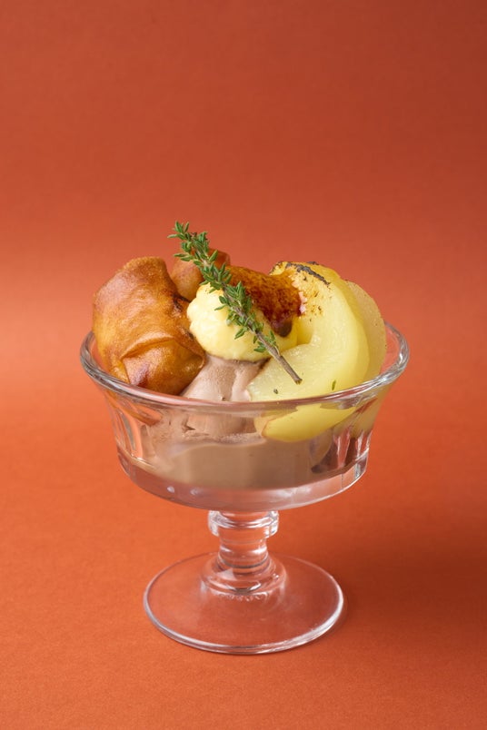 チョコレートとキャラメリゼ林檎のミニパフェ温かい揚げチョコと濃厚チョコレートアイスに、甘酸っぱい自家製コンポートりんごとカスタードを合わせ、キャラメリゼで仕上げたミニパフェ。