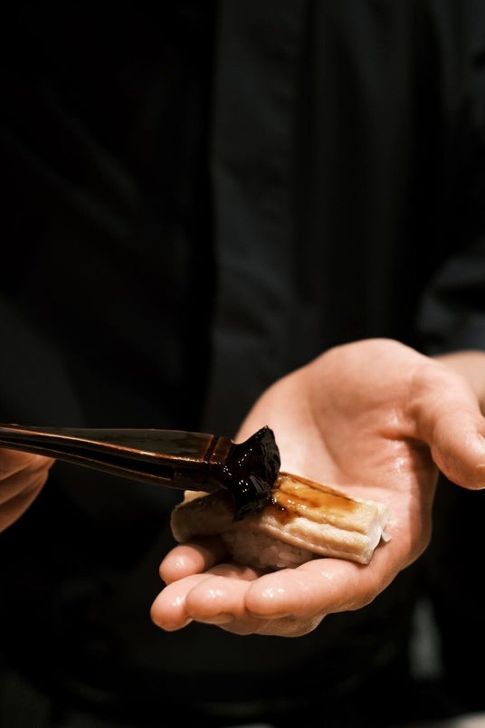 煮穴子に艶やかなツメを重ねる仕上げのひと手間。職人の手仕事とともに完成の一貫を味わう