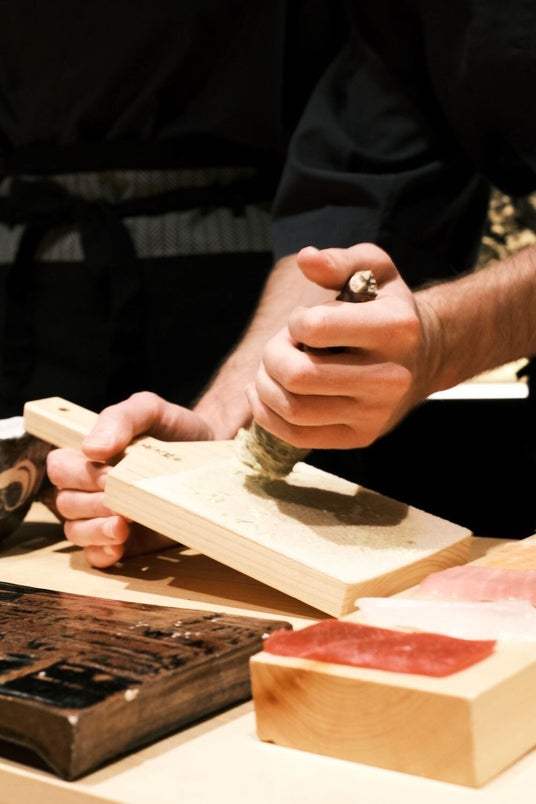 鮫皮おろしで擂る本山葵。伝統的な食文化の体験