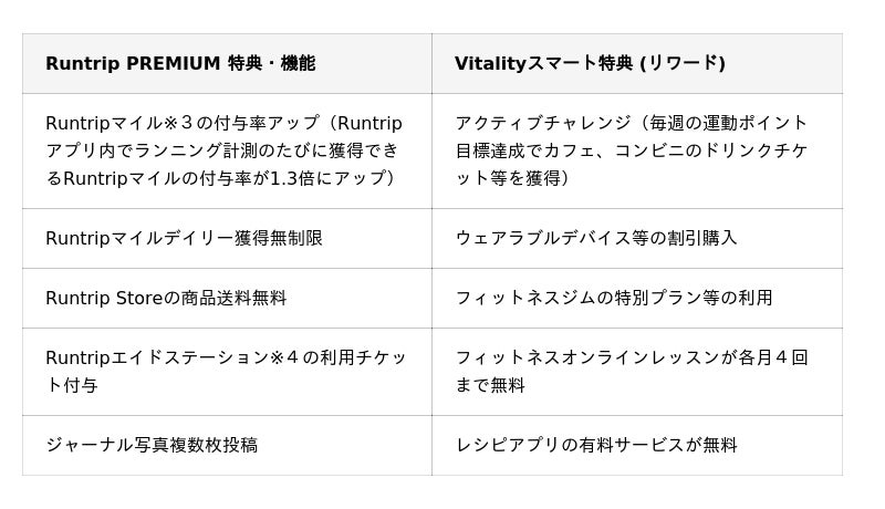 本商品は、住友生命がVitality健康プログラムの一部を保険契約と切り離して単独で提供する「Vitality スマート」と、楽しく走る体験のサポートを目的としてラントリップが提供するRuntripアプリの有償サービス「Runtrip PREMIUM」を組み合わせた商品です。いつものランニングでご褒美獲得