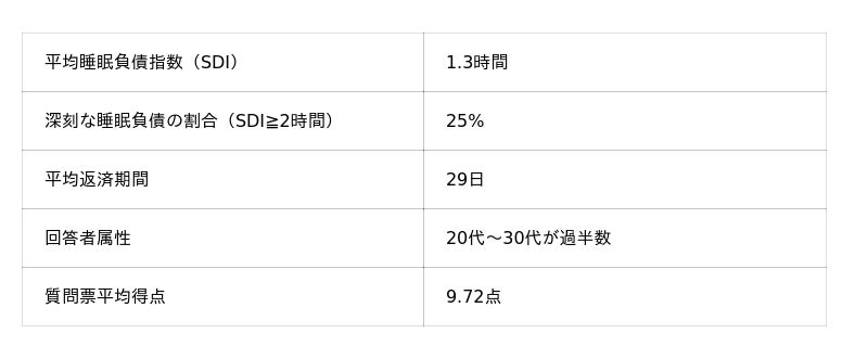 1. 睡眠負債指数は平均1.3時間--約1ヶ月の返済期間が必要睡眠負債指数とは、理想の睡眠時間と実際の睡眠時間から算出される指標であり、日中の眠気や抑うつ傾向、仕事のパフォーマンスとの関連性が明らかになっています(※2)。今回の調査では約4人に1人(25%)が深刻な睡眠負債を抱えており、現実的に確保可能な睡眠延長を行っても、完全解消までに平均29日を要することが試算されました(※3)。