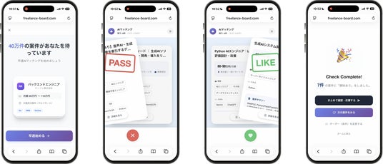 提案された案件はカード形式で表示され、左スワイプ(興味なし)/右スワイプ(興味あり)で素早く選別できます。