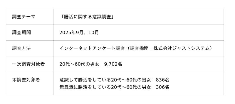 今回の調査では、腸活の実施状況や目的、具体的な取り組み方法に加え、近年注目されている「腸管バリア機能・リーキーガット(腸もれ)」に対する認知度などを明らかにしました。
