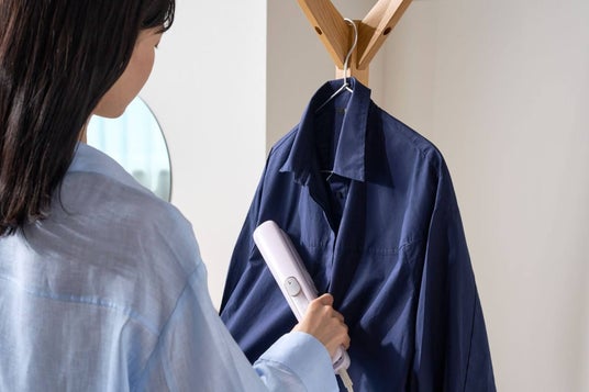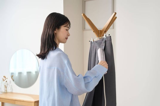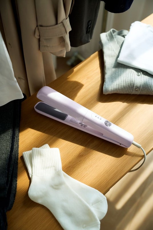 ヘアアイロン型の衣類スチームアイロンで、袖・襟・胸元は挟むだけの時短ケア