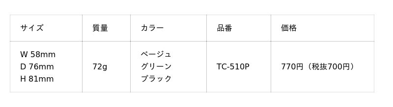 本体カラーは、ベージュ、グリーン、ブラックの3種類、メーカー希望小売価格(税込)は770円です。