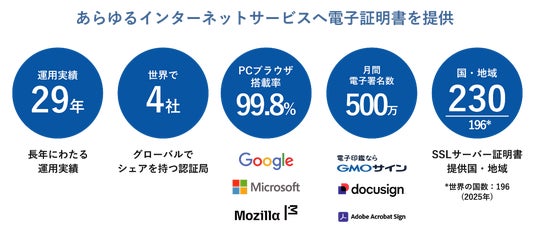 日本発の最上位認証局「GlobalSign」を運営し、世界11か国の拠点から各国の政府機関や企業に電子認証や電子署名の技術を提供しています。さらに、これらの技術を活用した国内シェアNo.1電子契約サービス(※2)「電子印鑑GMOサイン」を企業や自治体に提供し、安全な社会インフラを支えています。