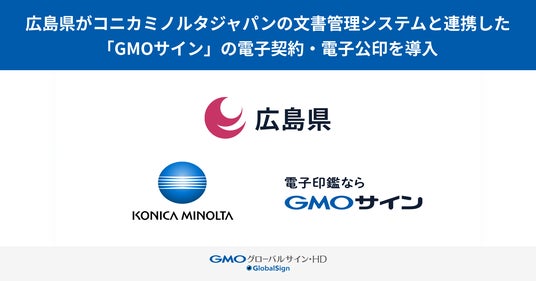 GMOグローバルサイン・ホールディングス株式会社(本社:東京都渋谷区、代表取締役社長:青山 満、以下 GMOグローバルサイン・HD)とコニカミノルタジャパン株式会社(本社:東京都港区、代表取締役社長:一條 啓介、以下 コニカミノルタジャパン)は、「GMOサイン行革DX電子契約」(以下、GMOサイン)および「GMOサイン行革DX電子公印」(以下、GMOサイン電子公印)と、コニカミノルタジャパンが自治体・行政向けに導入支援を行っている文書管理システムとの連携を実現し、広島県(知事:横田 美香)への導入が決定したことをお知らせいたします。