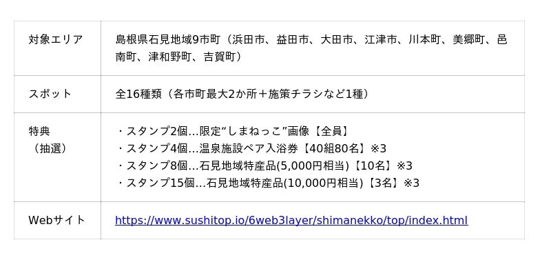 SUSHI TOP MARKETING株式会社(東京都千代田区、代表取締役CEO:徳永大輔、以下「当社」)は、日本郵便株式会社(東京都千代田区、代表取締役社長兼執行役員社長 小池 信也、以下「日本郵便」)が公益社団法人島根県観光連盟(島根県松江市殿町1番地、会長 鷦鷯 順、以下「観光連盟」)および島根県教育委員会から委託を受けて、島根県石見地域で同時運営する、2つのデジタルスタンプラリーにNFT配布技術を提供いたします。