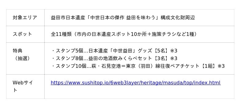 日本郵便はこれまで島根県大田市大森町(石見銀山エリア) や宮城県東松島市において、郵便局ネットワークやデジタル技術(NFT※1)を活用し、観光体験向上、地域ファン増加および地域全体の活性化を目指した取り組みを行ってきました。 これらの仕組みを活用し、公益社団法人島根県観光連盟から島根県石見(いわみ)地域※2の観光スポットを、島根県教育委員会から島根県益田市の日本遺産を、それぞれ対象としたデジタルスタンプラリー業務を受託します。当社はこちらの2つのデジタルスタンプラリーにNFT配布技術を提供いたします。