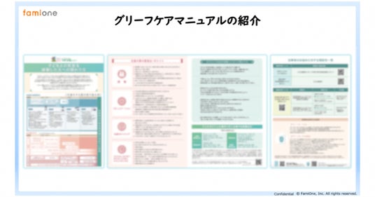 さらに、本研修の実施とあわせて、支援現場での実践につなげることを目的とした「グリーフケア支援者向けマニュアル」をファミワンが作成しました。研修で扱った内容や当事者への関わり方のポイントを整理するとともに、支援者が迷いやすい場面での考え方や声かけの視点なども盛り込み、研修後も継続して学びを振り返り、現場で生かせる内容としています。学びと支援現場での実践をつなげるツールとしての活用が期待されます。