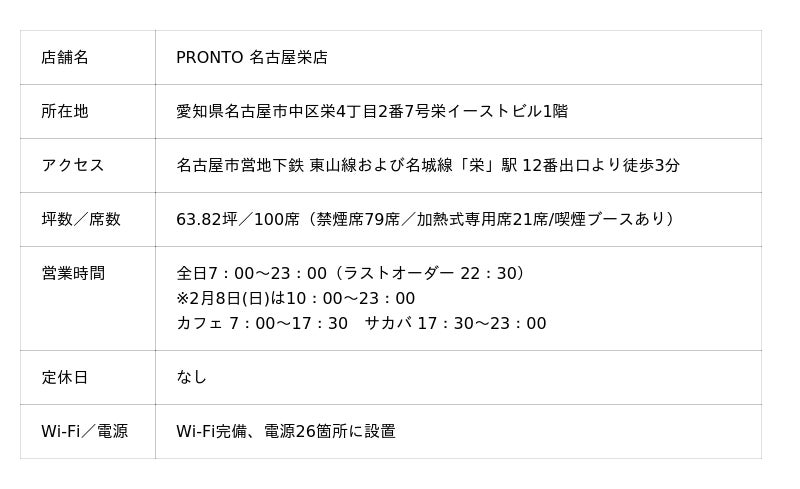 株式会社プロントコーポレーション(本社:東京都港区、代表取締役社長:杉山和弘)は「PRONTO(プロント) 名古屋栄店」を、2026年2月8日(日)にオープンします。栄エリアへは今回が初出店となり、名古屋市内では合計6店舗目の展開となります。