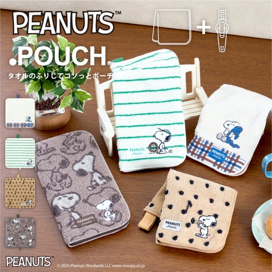 タオルのふりしてコソッとポーチの「どっとポーチ」に、スヌーピーデザインが新たに6アイテム登場!アイアップ公式オンラインストアで好評予約受付中。