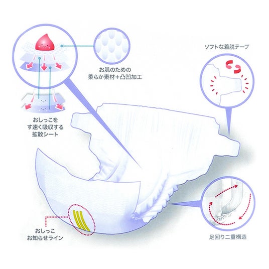 やわらか素材で赤ちゃんの肌にやさしい赤ちゃんのお肌に触れる内側のシートには、やわらかな肌触りの米国産の綿パルプを使用しています。おしりに触れる面に施した凸凹加工で、通気性が良く、濡れてもお肌に触れる面が少ない設計です。