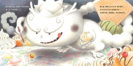 ▲実際の絵本のページ。くたくたのおにんぢゃくんの目の前にふわふわのベッドが現れます。すいこまれるように潜り込もうとするおにんぢゃくんですが、じつはこのベッドは「わたあめおに」だったのです……! どうなる?! おにんぢゃ!