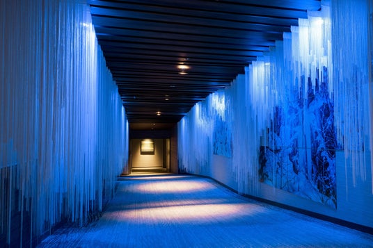 昼夜で表情を変える氷瀑の美しさを表現した空間演出です。日中は太陽の光を受けて白くきらめく昼の氷瀑、夜間はライトアップにより幻想的に浮かび上がる夜の氷瀑を、氷の層を再現した氷のカーテンや、アートパネル、照明演出で表現しています。館内にいながら、奥入瀬渓流の冬ならではの幻想的な世界観を体感できる空間です。